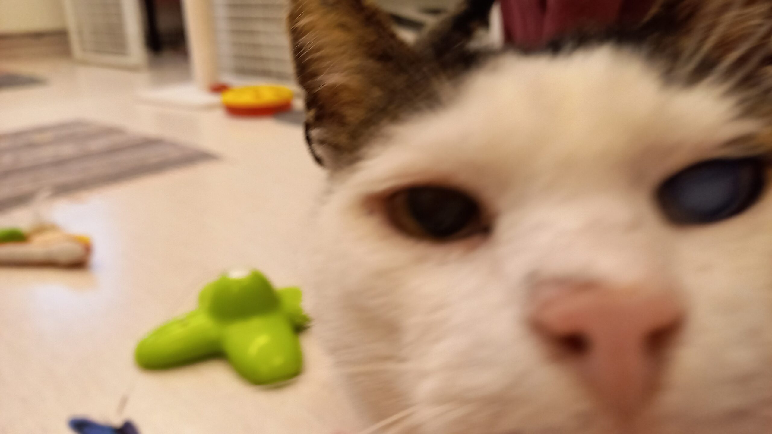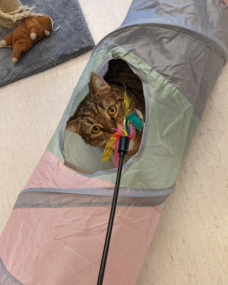 Effie har blivit mycket mer intresserad av att vara med och leka också! Hon är inte så intresserad av att bli borstad, men det börjar gå lättare nu när man kan distrahera lite med leksaker. 😸