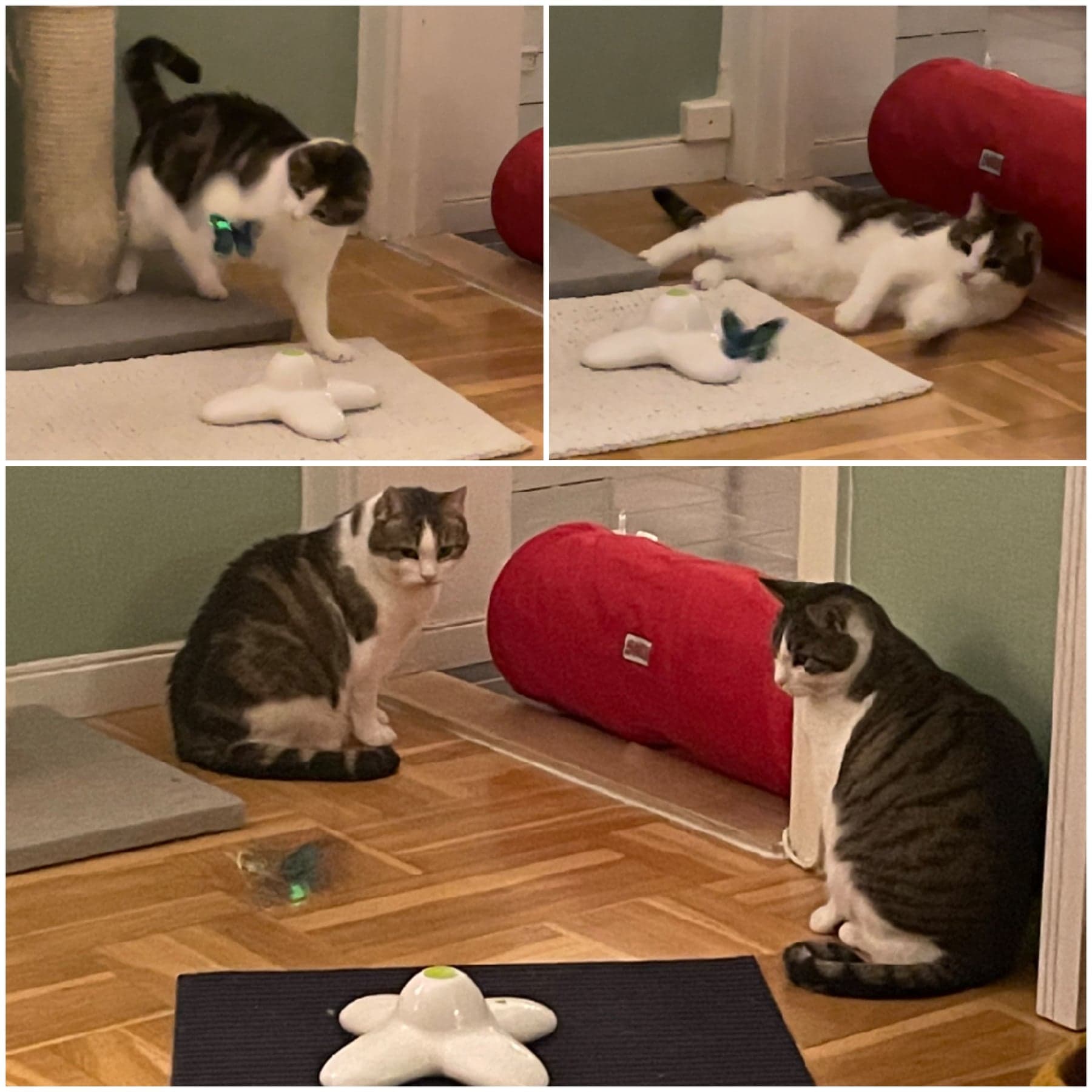 Hej! Här har katterna extra mycket balkonghäng nu när solen lyser mer och varmare på dagarna. De har också fått en sån där rolig leksak med en flaxande fjäril som kompisarna på katthemmet har. Den har gjort succé även hos Mörbyligan och framförallt Leffe & Nina leker med den så fort den kommer fram.