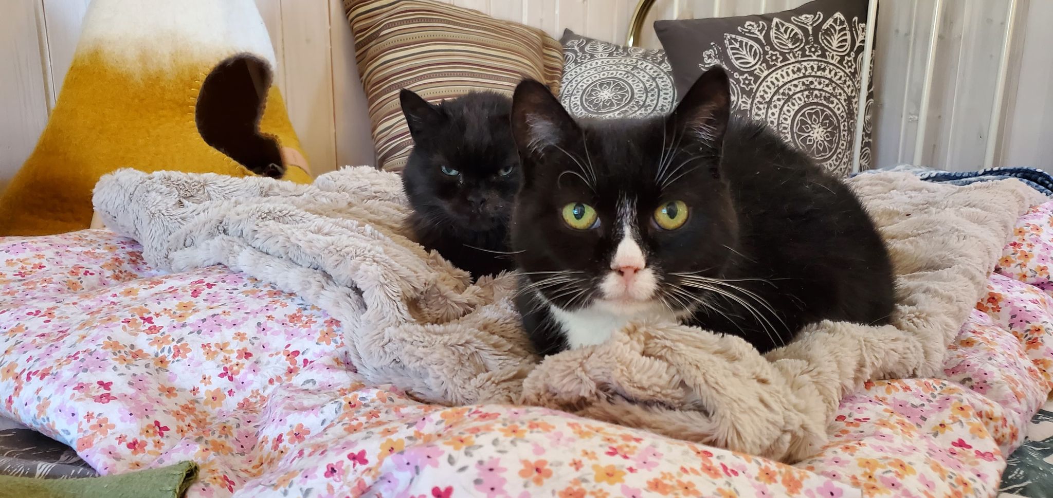 Vi gör det mesta tillsammans, vi busar, vi äter samtidigt ur samma skål, vi sover tätt intill varandra, vi tvättar varandra och buffar och gosar. Jourmatte tycker väldigt mycket om oss! Hon säger att vi är roliga, nyfikna, sociala och väldigt duktiga. Vi sköter lådan exemplariskt, vi klöser på våra klösmöbler och vi håller oss till kattmaten och snor inte från tvåbeningarna… 😺😻