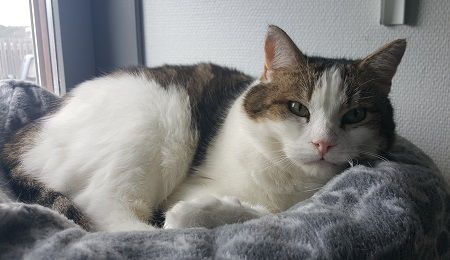 Leif har funnit sig väl tillrätta på katthemmet och älskar att mysa i alla mjuka bäddar och att få lite extra gott.